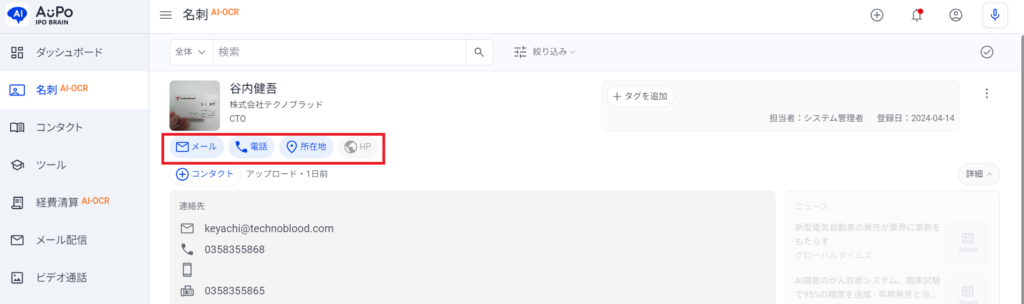 名刺管理機能 各機能について 2024.03.08 1.青いボタンをクリックすることで各ショートカット機能を使えます メール…登録されてるメールアドレスにメールができます電話…登録されてる電話番号に電話ができます所在地…登録されてる住所が表示されますHP…登録されてるホームページにアクセス Post Share Hatena Pocket RSS feedly Pin it